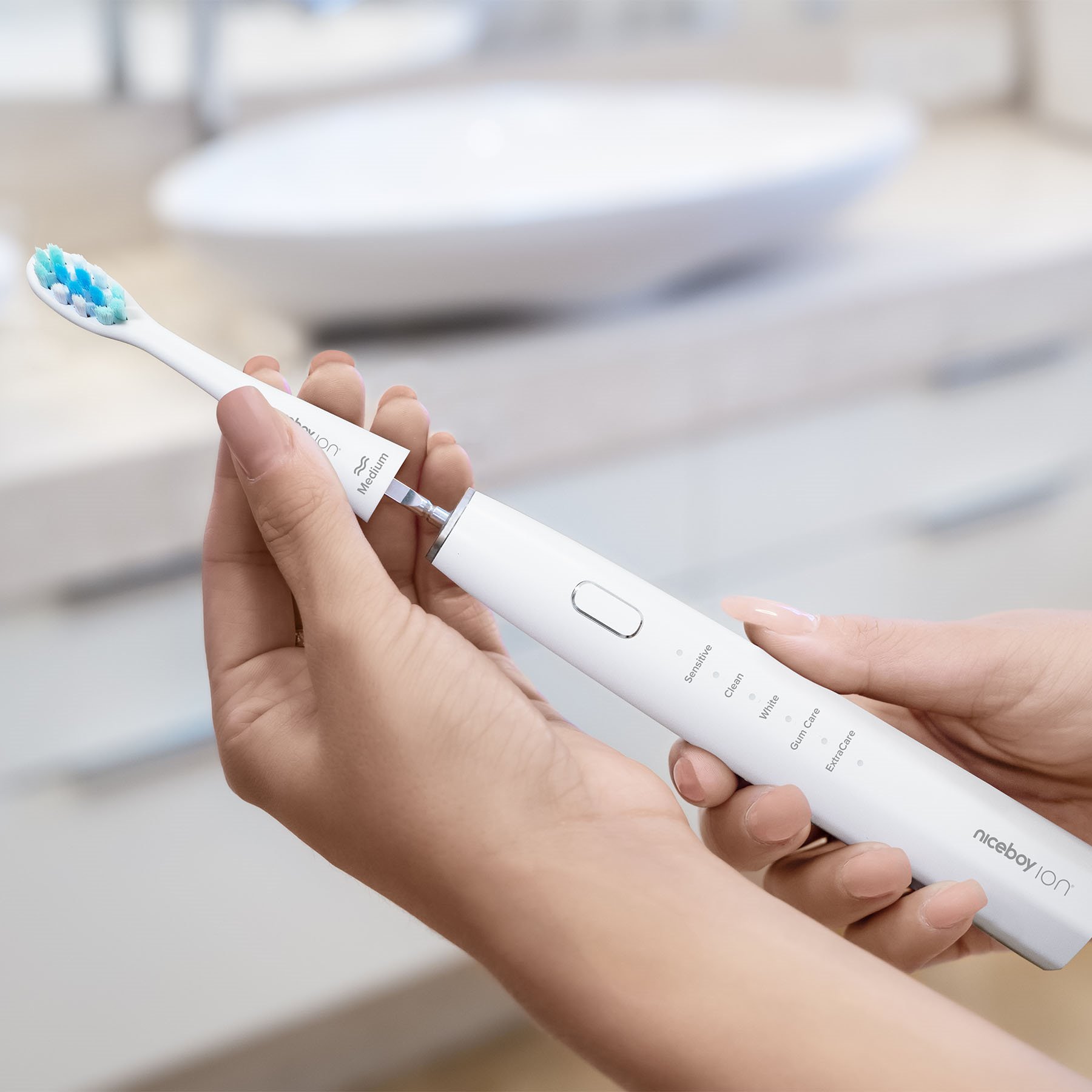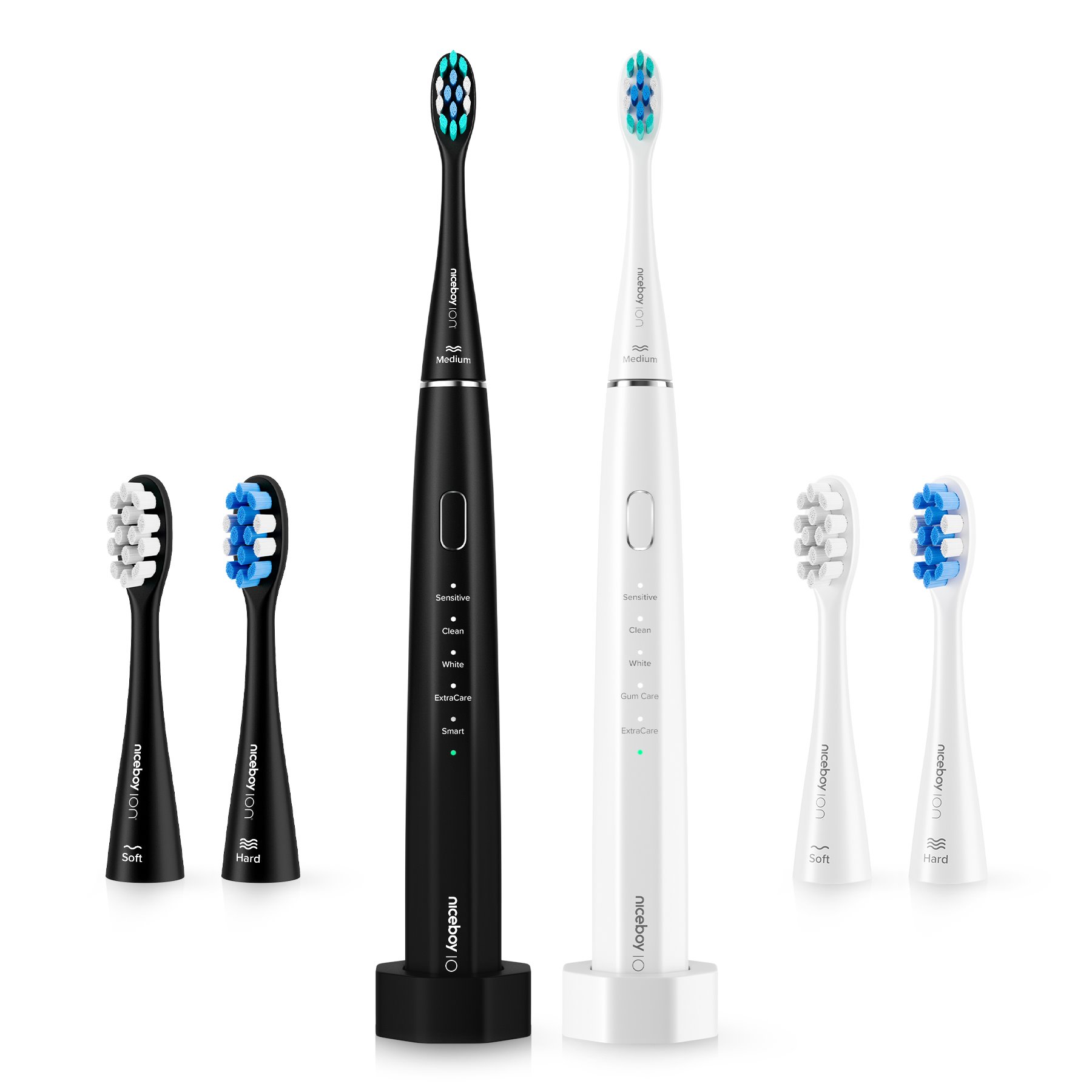 Můžete si rovnou vybrat přesně takovou tvrdost kartáčku jaká vyhovuje zrovna vám. Přímo v balení kartáčku Niceboy ION Sonic totiž máte na výběr ze setu tří hlavic všech tvrdostí - měkké (soft), středně tvrdé (medium) a tvrdé (hard).