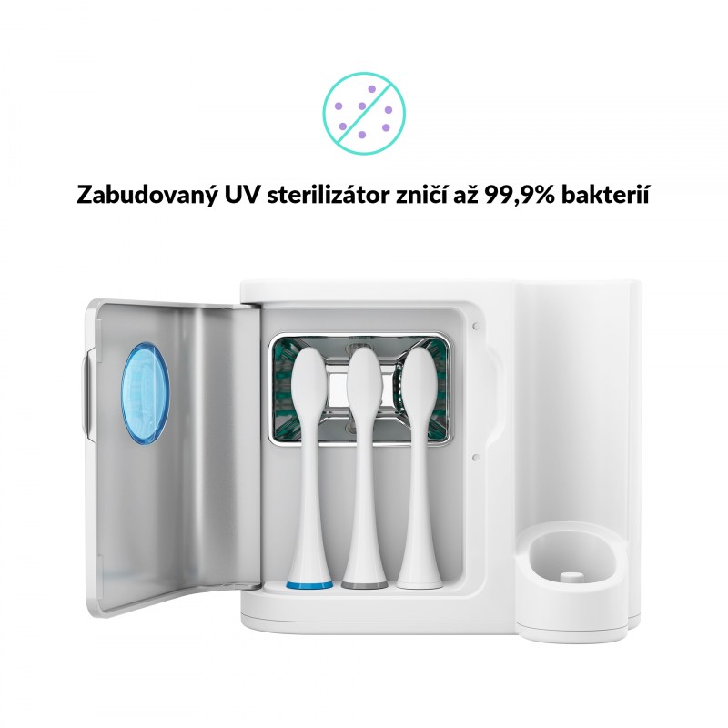 - UV světlo během chvíle dezinfikuje hlavu kartáčku a zničí až 99,9 % bakterií – čistá ústa začínají čistým kartáčkem.