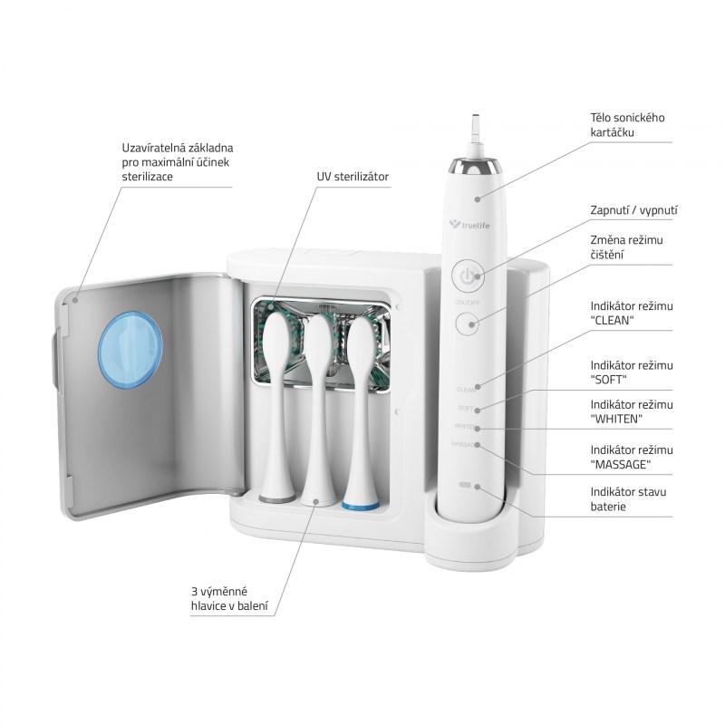 - Díky bohatému příslušenství může SonicBrush UV využít celá rodina. V balení máte hned 3 barevně odlišné hlavice.